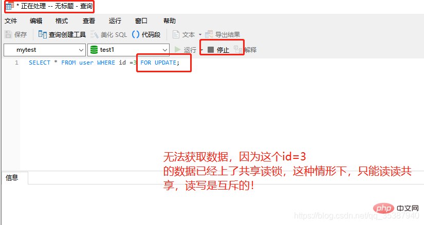 3.那么也是基于当前情况,我们再执行一下使用排他写锁的查询语句,可以发现 读写互斥了: