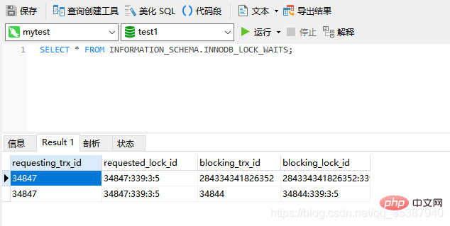 可以从结果中看出 事务请求id 34847在等待锁: