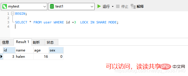 登录后复制上行级共享锁,也就是行级共享读锁: