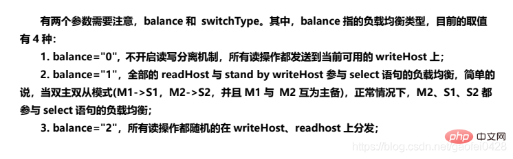 <dataHost name="dthost" maxCon="500" minCon="10" balance="1" writeType="0" dbType="mysql" dbDriver="native" switchType="-1" slaveThreshold="100">