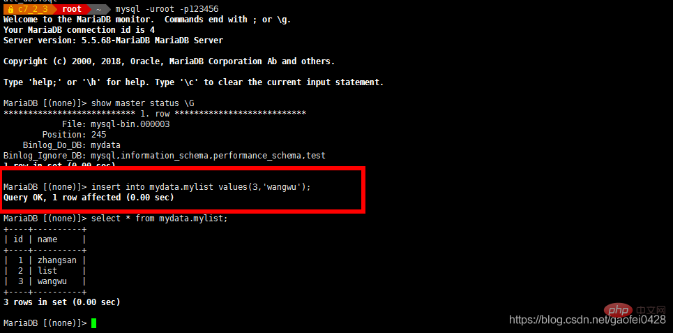 - 在主数据库端 192.168.2.3 添加一些数据,观测从数据库是否同步