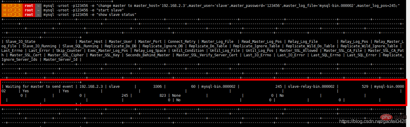 - mysql -uroot -p123456 -e "change master to master_host='192.168.2.3',master_user='slave',master_password='123456',master_log_file='mysql-bin.000002',master_log_pos=245;"