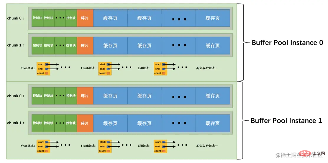 上图代表的Buffer Pool就是由2个实例组成的,每个实例中又包含2个chunk。
