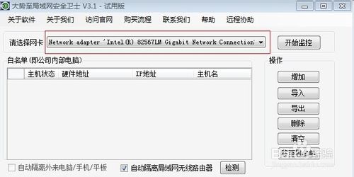 7、点击“开始监控”,然后会在“白名单”中列出局域网中当前工作的电脑,并实现IP地址与MAC地址的绑定。