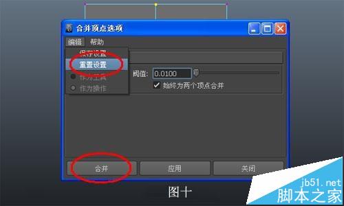 将状态栏的模块选择区调整为“多边形”板块,单击“编辑网格”,再单击“合并”后边的“□”,重置设置后单击“合并”(图十),