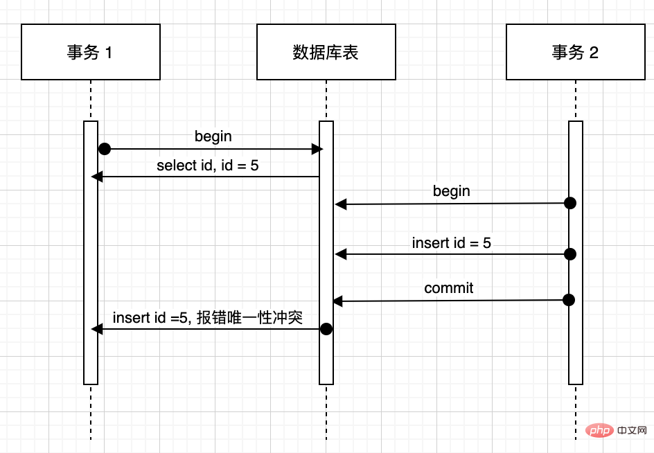 - 事务 1 插入 id = 5 时,发现报错唯一性冲突,对事务 1 来讲就好像见了鬼了,我刚刚明明检查过没有,怎么这时候又有了。