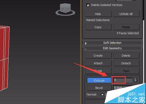 5、按下键盘上的数字4键进入多边形层级,在透视图里选择两个侧面,找到下面的extrude选项,设置其值为5,如图所示: