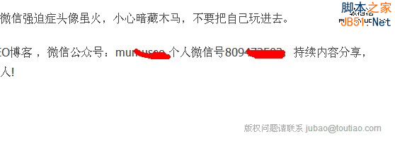 不用说,那一定是内容了,今日头条本来就是一个内容展示平台,在我们发布的文章中可以夹带产品信息,也可以夹带品牌信息进行宣传曝光,不过更多的是留下联系信息,吸引粉丝。今日头条可以留微信公众号,也可以留私人微信号,不过不能留QQ号,知不知道我怎么留的?如下图,我都感觉太无聊了,就写个人微信就OK了,这设计得太没节操了。