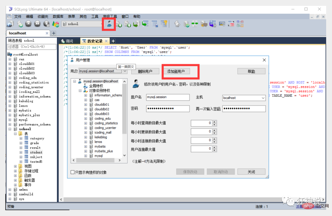 - 必须拥有mysql数据库的全局CREATE USER权限,或拥有INSERT权限。