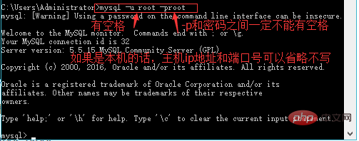 注意:如果是本机的话,主机ip和端口号可以不写(即主机ip和端口号可以省略),直接写成mysql -u root -proot