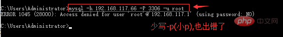 有的人写成mysql -h 192.168.117.66 -P 3306 -u root 注意:少写-p(小p),这种写法也出错了,如下图: