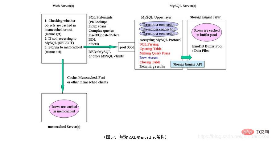 HandlerSocket与MySQL+Memcached的区别在哪呢?对比图1-2和图1-3,可从中看出其不同点,图1-3展示了典型的MySQL+Memecached的应用架构。因为Memcached的get操作比MySQL的内存中或磁盘上的主键查询要快很多,所以Memcached用于缓存数据库记录。若是HandlerSocket的查询速度和相应时间能与Memcached媲美,我们就可以考虑替换Memcached缓存记录的架构层。