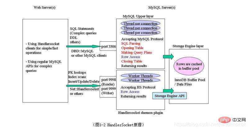 从上图可以看出,HandlerSocket作为mysql客户端和mysql的中间层,取代mysql原生的部分数据、表格处理工作,采用多线程的方式,区分DDL和DML进行操作。这样的目的是保证在复杂处理的情况下,能够高效的进行处理。