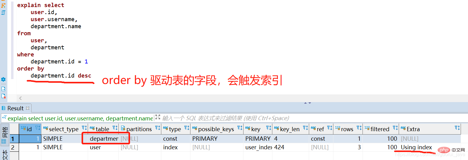 对驱动表直接进行排序就会触发索引,对非驱动表进行排序不会触发索引。