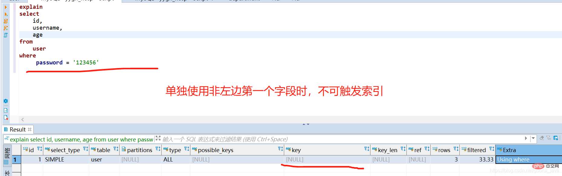 (4)单独使用联合索引的其它字段时,不可触发联合索引