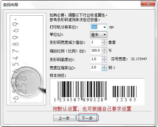 2、这里按默认设置,生成条码后这些参数可以在CorelDRAW X4 软件进行设置,在次点击下一步,然后在点击完成。