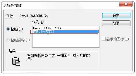 4、这时选中条码进行“Ctrl+C”复制,然后点击菜单上的“编辑”-“选择性粘贴”,弹击“选择性粘贴”对话框,选中“图片(元文件)”在点击确定。