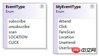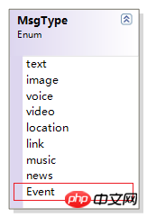其他的类型不说,而当MsgType为Event时,消息便是EventBaseMsg的子类了,所有EventBaseMsg的子类的MsgType都是Event,所以EventBaseMsg类型又有个EventType来区分不同的事件,如果你看过接口文档,你应该知道,它的事件类型对我们判断到底是哪个事件不太友好,扫描二维码事件分了用户已关注和未关注两种情况,已关注时EvenType是scan,未关注时EventType是subscribe,而用户关注事件的EventType也是subscribe,所以SDK里又加了个MyEventType: