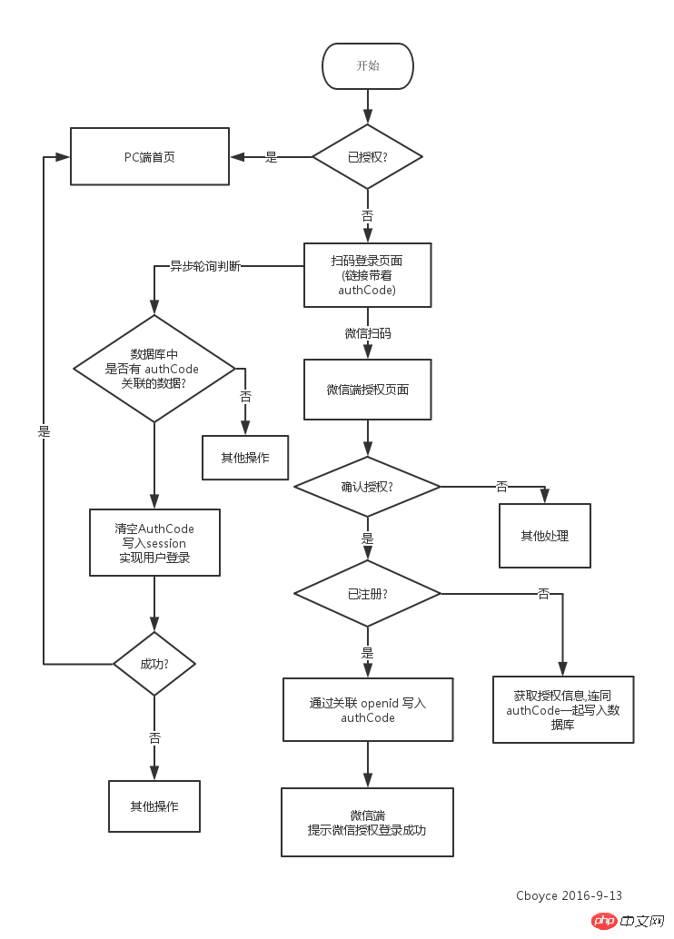 微信端的授权拿到 openid 做过微信开发的人都应该没有问题。问题是怎样来实现 PC 端 在注册或者登陆的时候拿到 openid。笔者的实现思路如下。PC 端注册,或者登陆时显示一个二维码引导用户使用微信扫码,使其跳转到授权页面。这一步有一个最为关键的细节,二维码请带上一个唯一的授权码(authCode)。试想一下如果用户授权后我们能把 openid 以及 authCode 写入到数据库。那么我们就可以在 PC 端通过某个 API 获取 authCode 所关联的这个 openid。如果我们做到这点我们就可以知道当前是谁在 PC 端进行扫码注册或登录(没注册的注册,有注册的直接登录)。 是不是突然觉得 so easy. 如果觉得文字比较抽象,请看下面图示