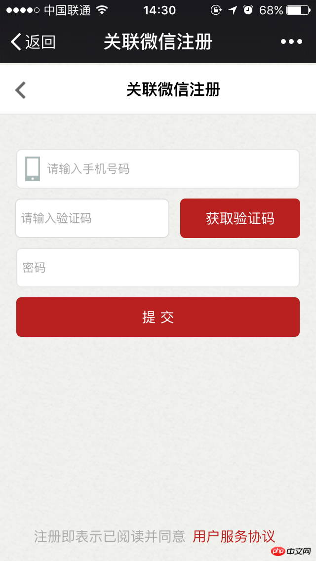 然后在网页端,则是需要编写H5页面,进行自己网站和微信用户的关联,我这里是使用手机号,用户输入手机号,进行判断,如果注册过就直接关联,如果用户没有注册则进行注册后关联,完成后跳转到会员中心。