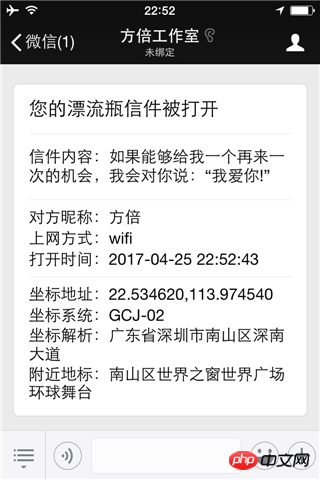 漂流瓶创建者同时收到打开者的位置信息。如图所示,点击个人头像还可以在地图上看到位置。