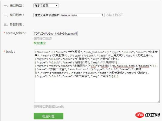 {"type":"click","name":"趣味游戏","key":"游戏"}, {"type":"click","name":"讲个笑话","key":"笑话"}]}]}登录后复制将以下代码保存为menu.php,并且在浏览器中运行该文件(比如 127.0.0.1/menu.php),将直接向微信服务器提交菜单