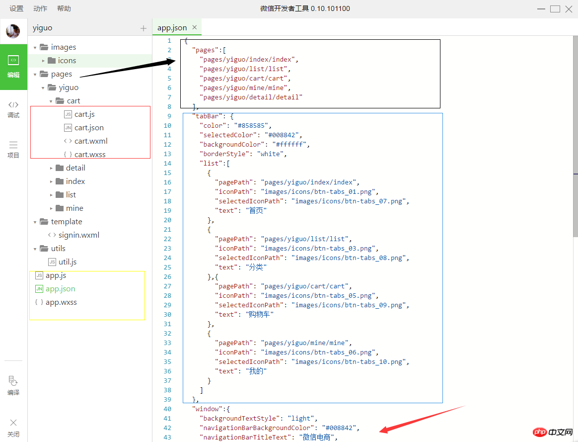 第一部分(黑色框)是pages是整个里的页面,每添加页面一个页面,都要把路径写在这里: