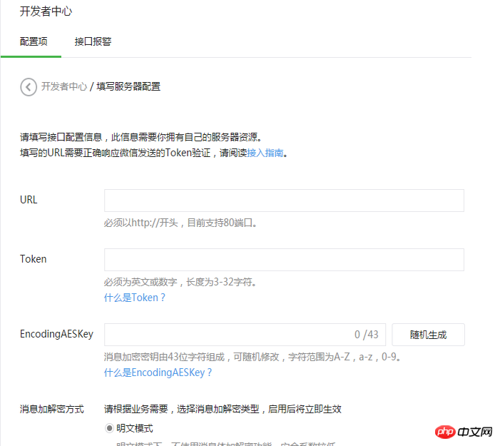 登录微信公众平台官网后,在公众平台后台管理页面 - 开发者中心页,点击“修改配置”按钮,填写服务器地址(URL)、Token和EncodingAESKey,其中URL是开发者用来接收微信消息和事件 的接口URL。Token可由开发者可以任意填写,用作生成签名(该Token会和接口URL中包含的Token进行比对,从而验证安全性)。 EncodingAESKey由开发者手动填写或随机生成,将用作消息体加解密密钥。