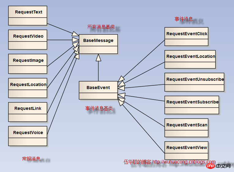 }登录后复制从上面的代码可以看出,不同的消息,到处理函数这里,就以不同的消息实体类的方式传递过来了(注意:实体类是我根据程序开发需要自己定义的,非微信本身的实体类),这样非常方便我们处理操作,否则每次需要解析不同的消息内容,很容易出现问题,这样强类型的数据类型,提高了我们开发微信应用的强壮型和高效性。这些实体类的对象有一定的继承关系的,他们的继承关系如下所示。