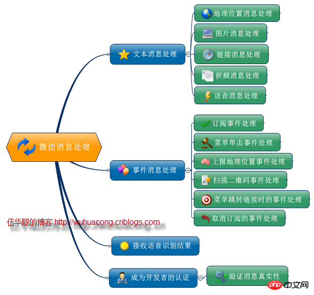 微信向开发者服务器请求的消息包含了多种类型,不过基本来说,分为了文本消息处理、事件消息处理、语音消息的识别,以及成为开发者之前的那个消息认证操作基本分类,下面是我绘制的一个消息分类图,其中介绍了这几种关系,以及各自的消息细化分类。