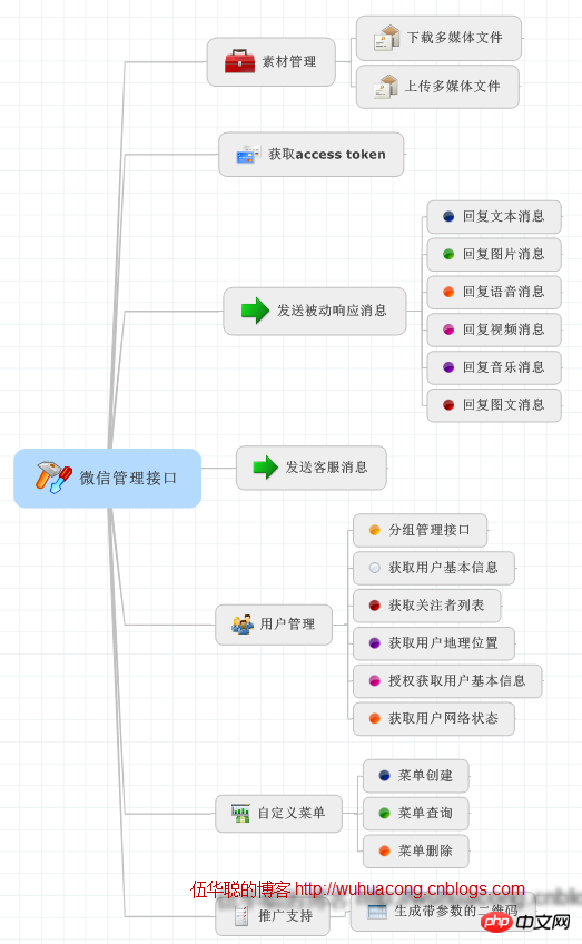 上面的消息分类是微信服务器向开发者服务器发送的消息请求操作,还有一种消息,是我们开发者服务器向微信服务器进行的消息请求或者响应,这种这里暂且称之为微信的管理接口,它表明了我们可以通过这些接口进行相关的消息回复或者数据管理操作。它的分类图如下所示。