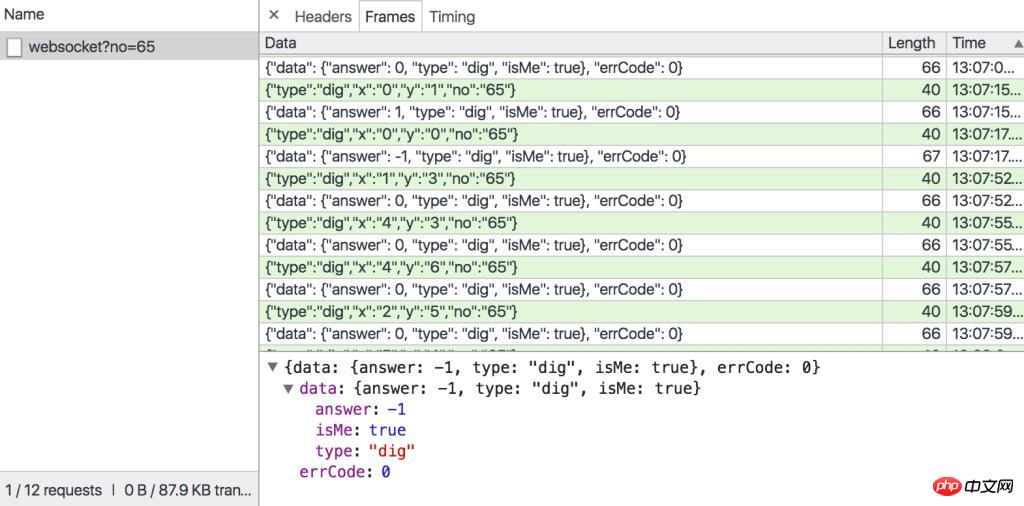 {errCode: 0, data: {type: 'dig', …} }登录后复制因为webSocket类型的消息跟传统的http请求不太一样,http请求没有状态,一个请求过去,一会儿就返回,返回的数据肯定是针对这个请求的。而webSocket的模型是这样的:客户端发过去很多请求,然后也不知道服务器返回的数据哪个是对应哪个请求,所以需要一个字段来把所有的返回分成多种类型,并进行相应的处理。