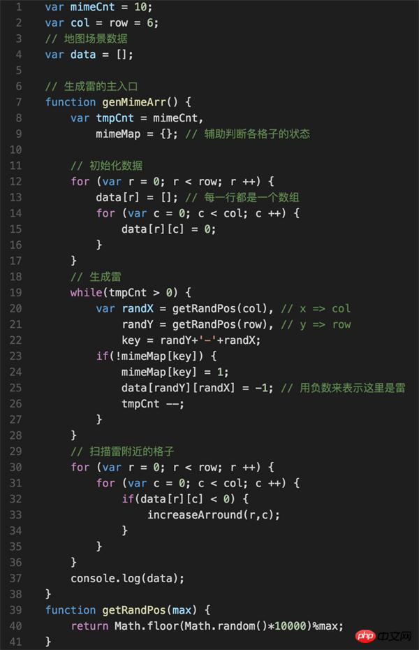 digGold是每个格子的点击事件处理函数。这儿有一个逻辑,一个格子周边最多有8个格子,所以每个格子的数据最大不可能大于8,上面代码中可以看到有一个9,这其实是为了跟0区分,用来表示场上目前的还没被翻开的格子的数据,用9来表示,当然你也可以用10,100都行。