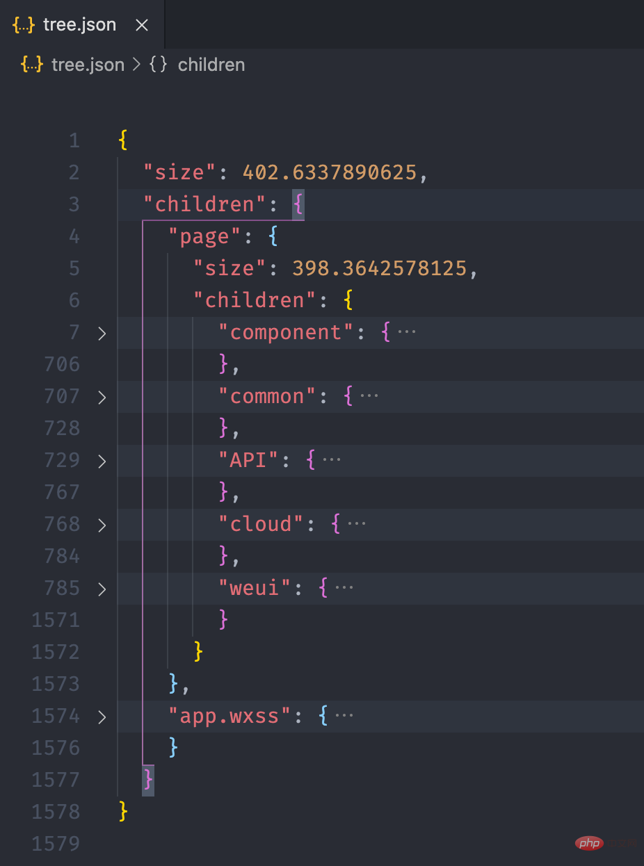 └── index.wxss复制代码登录后复制依据上面的目录结构,我们构造一个如下的文件树结构,size 用于表示当前文件或文件夹的大小,children 存放文件夹下的文件,如果是文件则没有 children 属性。