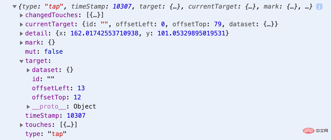 }复制代码登录后复制确定事件类型之后,还需要明确点击的元素到底是哪个,但是小程序里面比较坑的地方就是,event 对象的 target 属性中,并没有元素的类名,但是可以获取元素的 dataset。