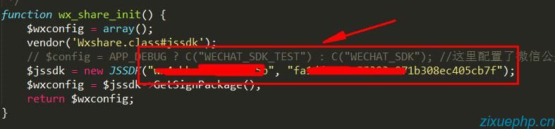 6、在thinkphp的common.php文件中定义好微信初始化函数:(下图案例中的参数应该是从配置文件中获取)