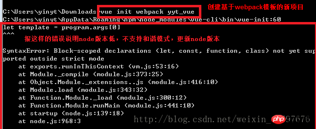 在创建新项目时,如果报以下错误,则说明node版本过低,不支持和谐模式(大概就是说支持es6,f否则不支持,具体还需大神指教),应换成高版本的node。错误如下图所示: