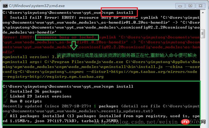 2).输入:cnpm install,回车,等待一小会儿