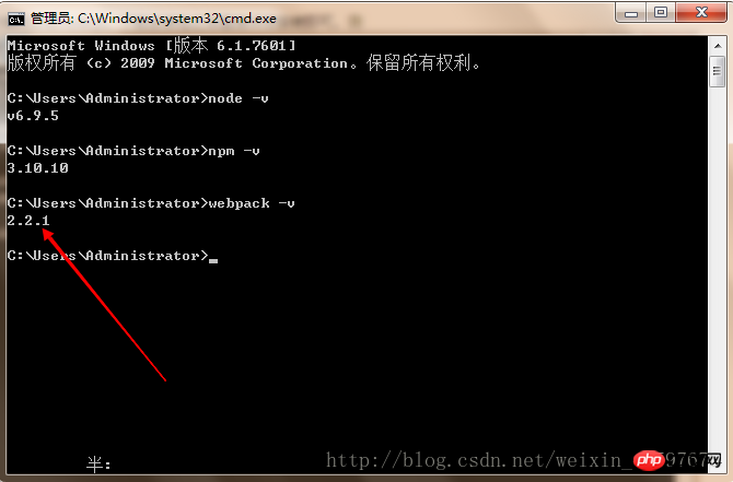 1.2、利用npm安装webpack命令行语句为npm install webpack -g。测试安装成功的界面如下: