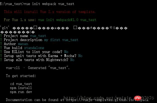 在cmd里输入vue init webpack my-project (项目文件夹名),回车后,等待一小会儿,依次出现‘git'下的项,可按下图操作