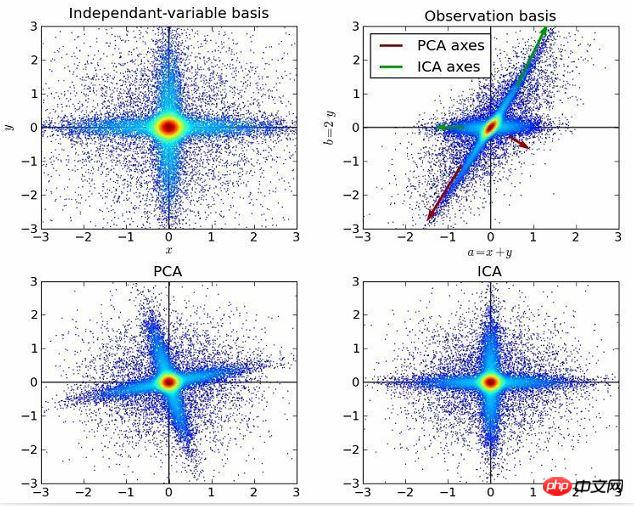 独立成分分析与主成分分析有关联,但它是一个更强大的技术。它能够在这些经典方法失效时仍旧找到数据源的潜在因素。它的应用包括数字图像、文档数据库、经济指标和心理测量。