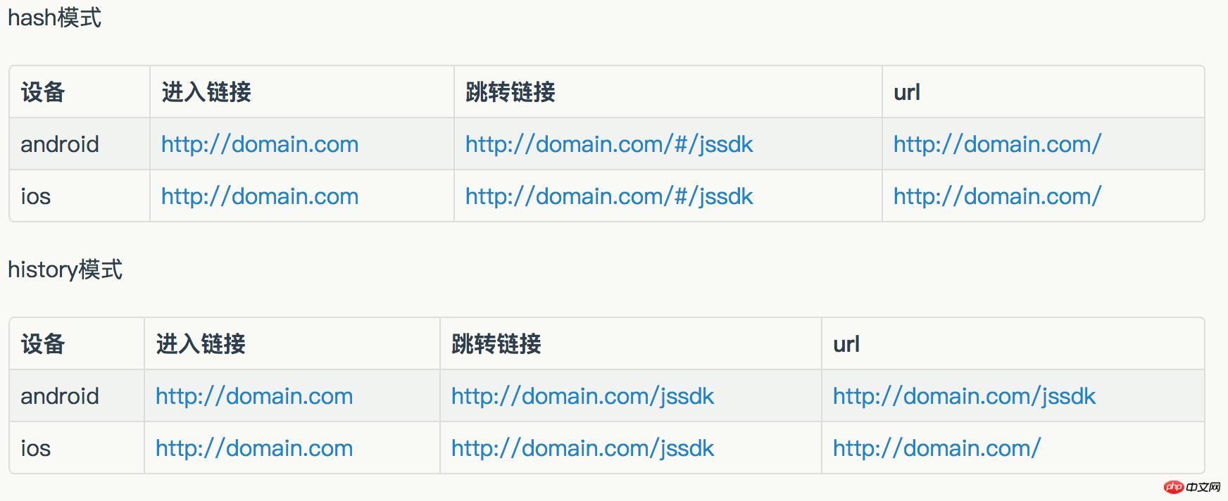 上篇文章,我推荐大家在vue中配置vue-router使用hash模式,那么hash模式和history模式到底有什么差别呢?我举个栗子,假设我们都通过http://domain.com进入,然后跳转到路由为/jssdk的页面需要用到jssdk,那么实际js-sdk进行签名校验时所获取的当前页面url在ios和andrioid是不同的,这里我通过表格展示出来: