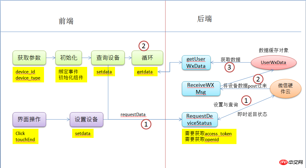 获取参数-->初始化-->setdata一次-->循环-->渲染页面 界面操作-->setdata-->延时读取。 加上后端的部分,全部的流程图如下。
