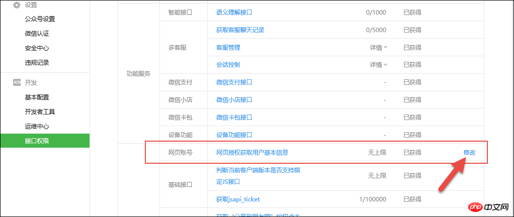 设置域名在【接口权限】【网页账号】【网页授权获取用户基本信息】的修改入口,如下图所示。