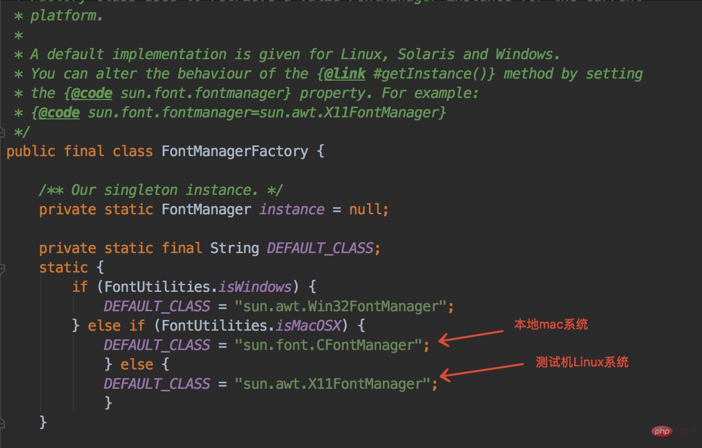 原来JVM创建Font的时候会使用FontManagerFactory获取FontManager,而不同的系统使用的FontManager是不同的!Mac用的是CFontManager,而Linux用的是X11FontManager!