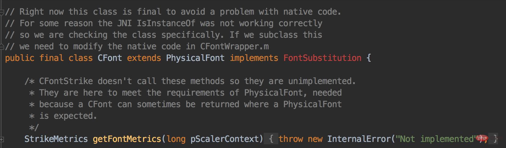 CFontManager会创建CFont作为Font2D,这个CFont是JVM专门为mac创建的类,看类和方法的注释可以知道在mac环境下有时候物理字体会被CFont包装,而这是在native代码中完成的: