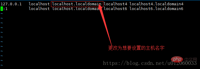 更改/etc下的hosts文件,在提示符下输入 vi /etc/hosts,然后将localhost.localdomian改为想要设置的主机名