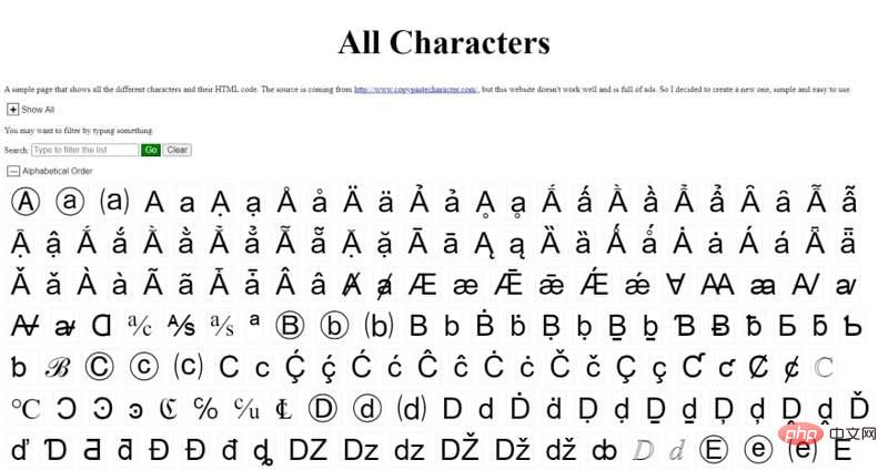 一个简单的页面,显示所有不同的字符及其 HTML 代码。
