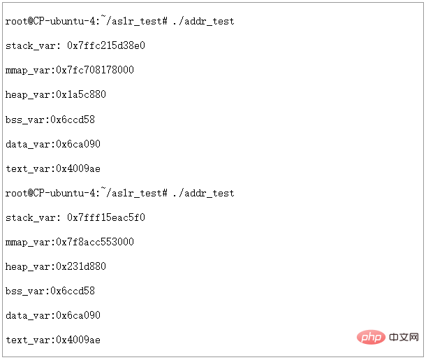 登录后复制我们还是以文章开头的那个程序来说明ASLR在不同级别下时如何表现的,首先在ASLR关闭的情况下,相关地址不变,输出如下:
