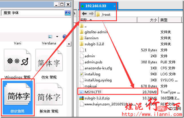 通过第一章节,我们知道目前系统中没有微软雅黑字体。我们现在需要把MSYH.TTF(微软雅黑字体文件)文件上传到linux服务器上。如下: